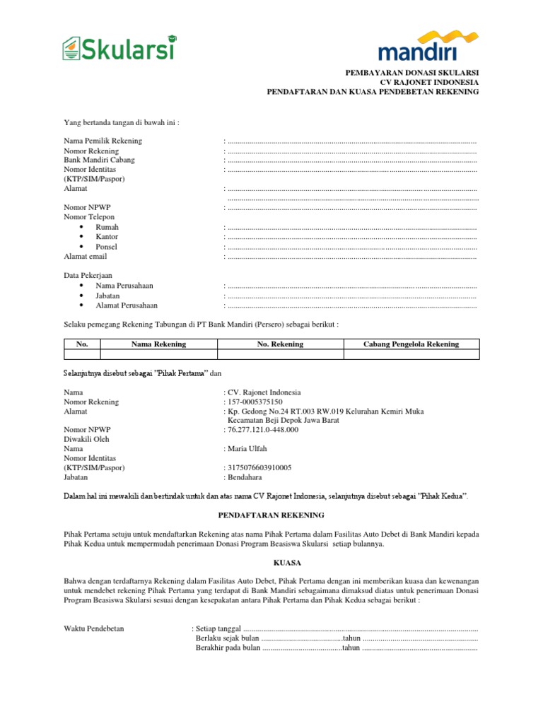 Jika terdapat perubahan keadaan yang mempengaruhi status pajak Pemegang Rekening yang dapat menyebabkan informasi yang tercantum dalam formulir ini menjadi tidak benar atau tidak lengkap mohon untuk memberi PT Bank Mandiri Persero Tbk formulir. Apakah Anda nasabah Bank Mandiri. Rate free form bank mandiri.